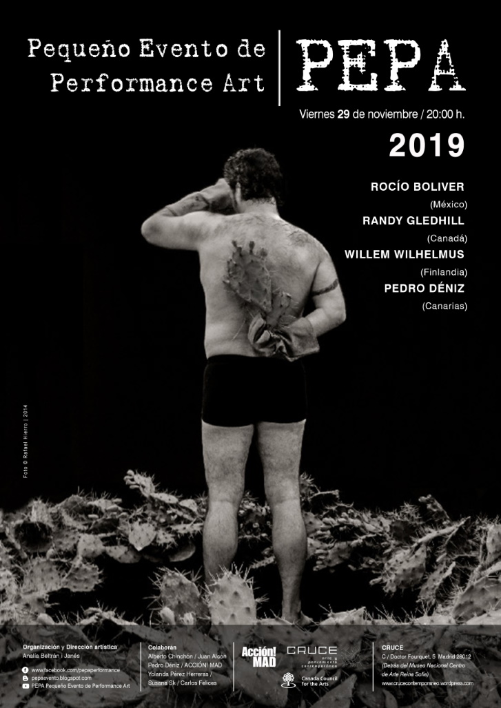 PEPA (Small Performance Art Event) is a performance event in Madrid organized by the action art artist Analía Beltrán i Janés that aims to cover the need in Madrid of performance art events in small, self-managed spaces with continuity over time in a monthly meeting. It’s itinerant, because the space in performance art is an element that gives character to the work and, therefore, the change stimulates the creativity of the artists. It’s a non-profit event, it doesn’t receive any funding. It’s a place for meeting and exchange of action art, open to the participation of performers of all ages and nationalities, where young artists can gain experience and those who have long career can try something new and, in this way, enjoy us all.